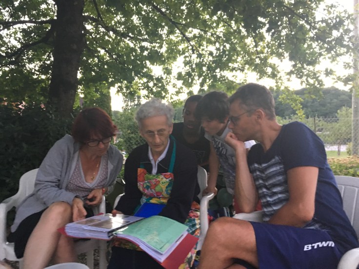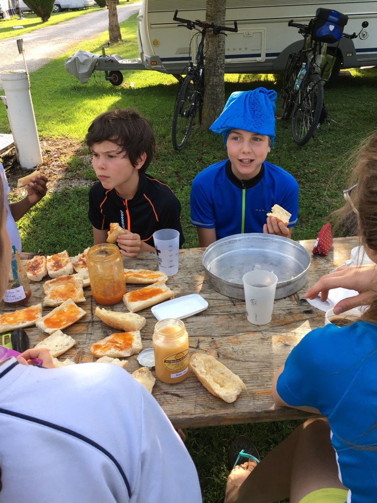 Mais notre grand moment du jour c’est l’anniversaire de Raphaël. 9 ans. Cela fait le 6 ieme anniversaire que notre bonhomme fête sur le vélo. Alors la présence de son copain Matthias avec nous est un vrai bonheur pour lui. Nous chantons « Joyaux anniversaire »au milieu des tartines.