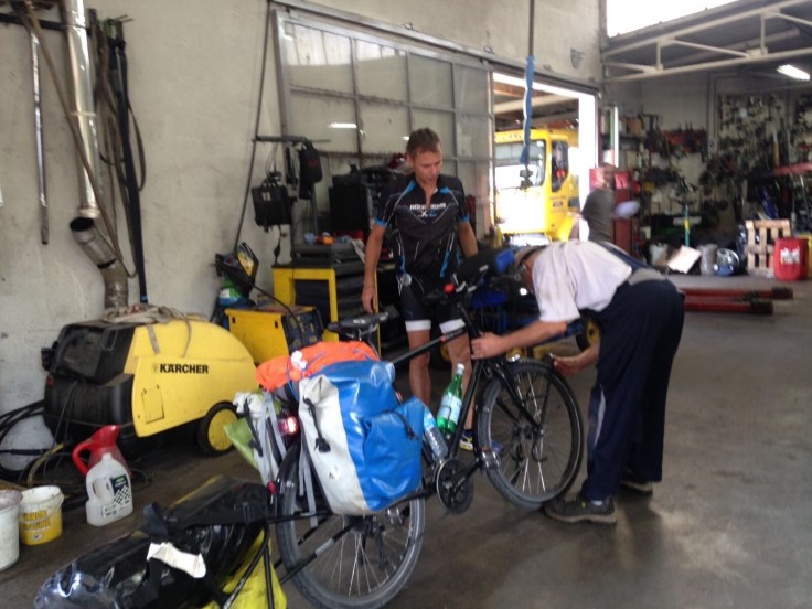 Nous sommes prêts à 9h45,c’est génial. Mais notre bonheur sera court car Raphaël a un trou dans son pneu. Et bien sûr, nous sommes dimanche donc tout est fermé. Nous perdons 1h car Pascal doit à nouveau mette une rustine et nous mettons du scotch épais au fond du pneu. Nous serons quand même obligé de faire un détour par Grant Casino pour en acheter un au cas où.
