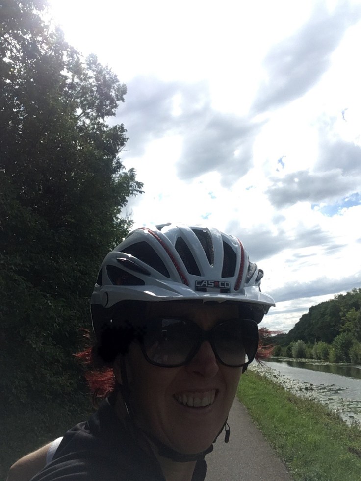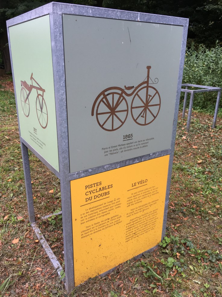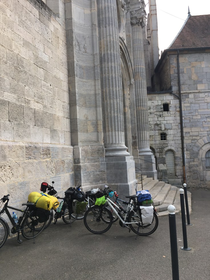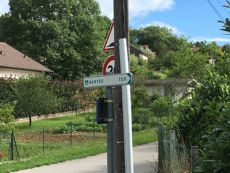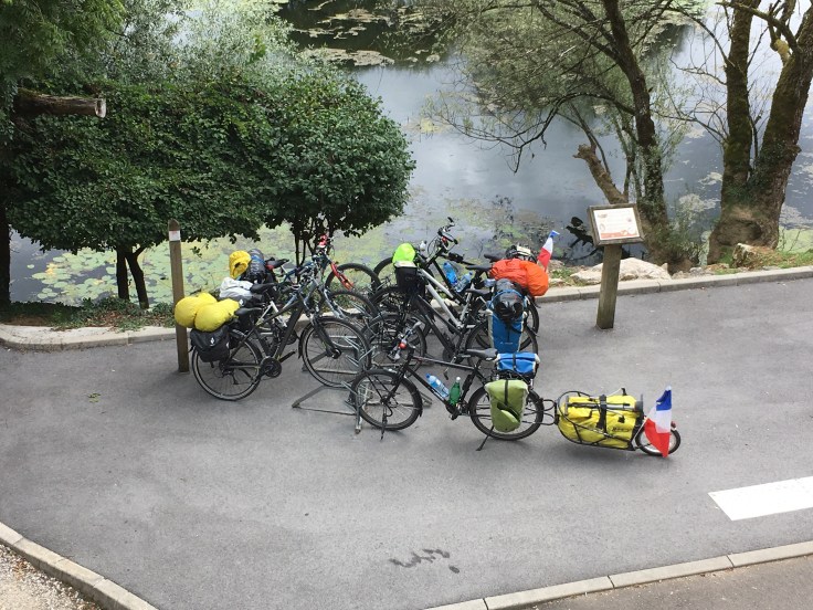 Nous pique-niquons au milieu d’un champ avant de repartir. Aujourd’hui pas de vent, nous pédalons vite. En même temps c’est une bonne chose car nous voulons rejoindre Verdun–sur-le Doubs. Nous espérons ainsi rattraper un peu le retard pris. Le vélo de Solène nous fait dun s misères. Crevaison et besoin de regonfler très souvent mais on avance bien.