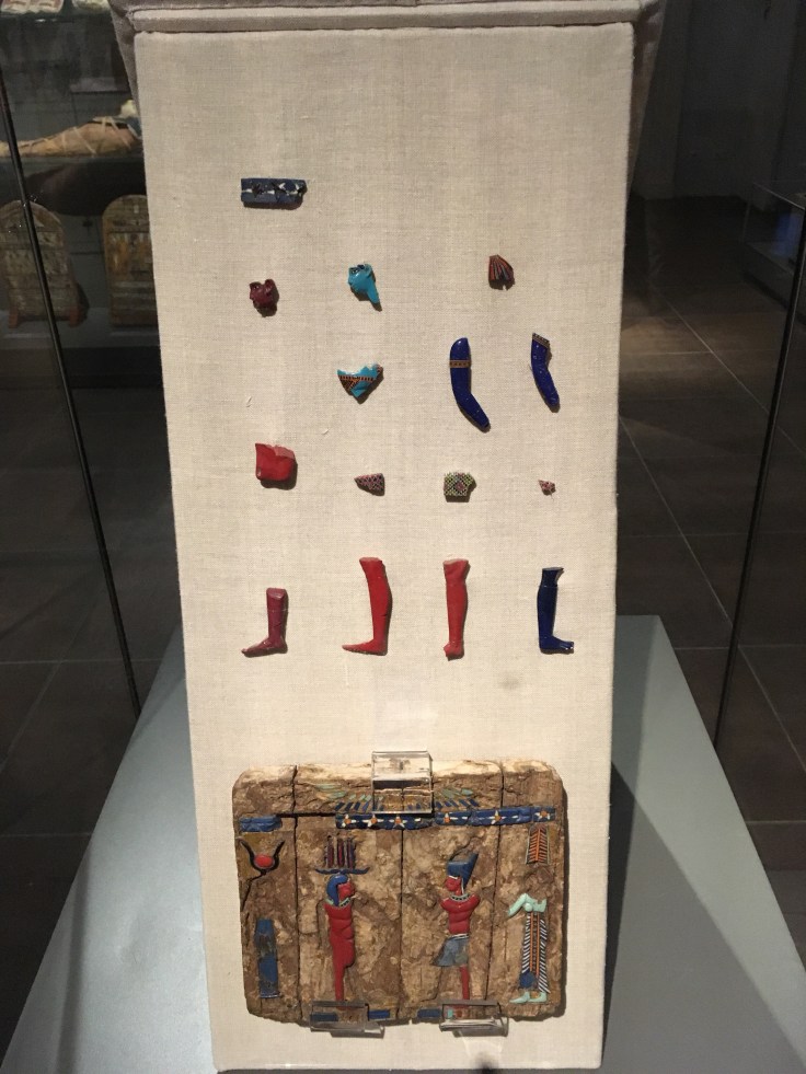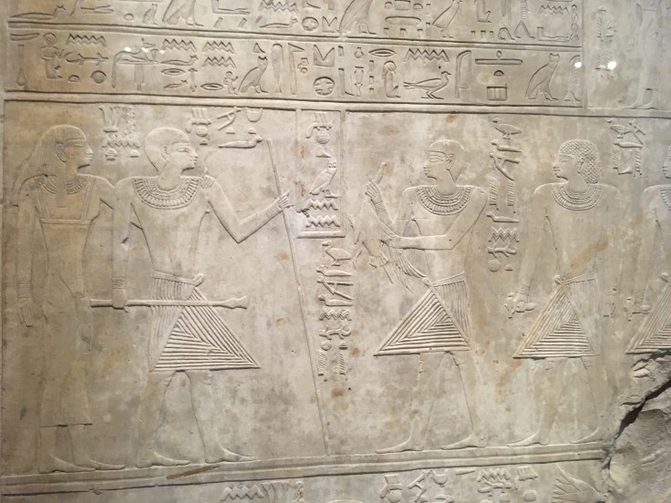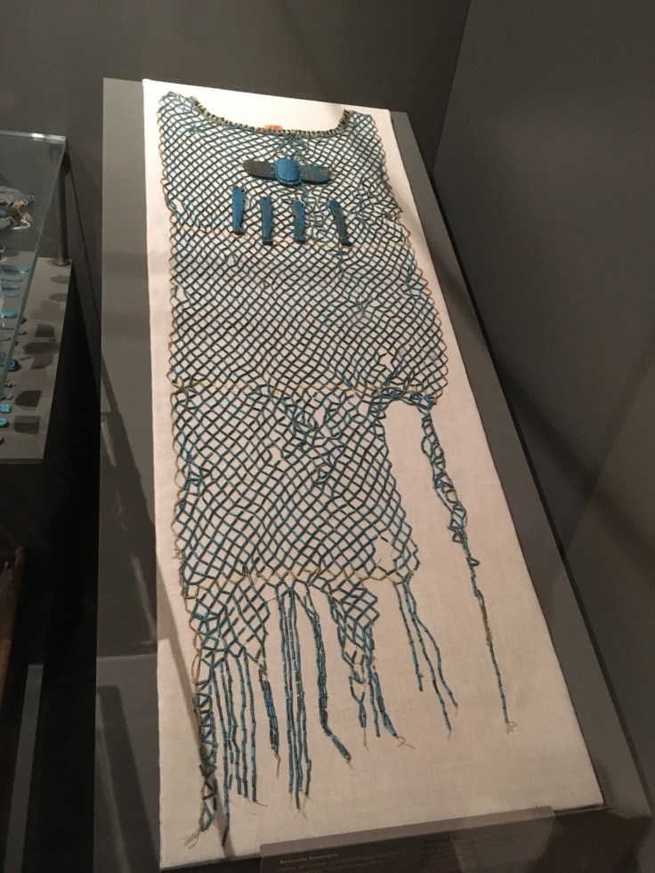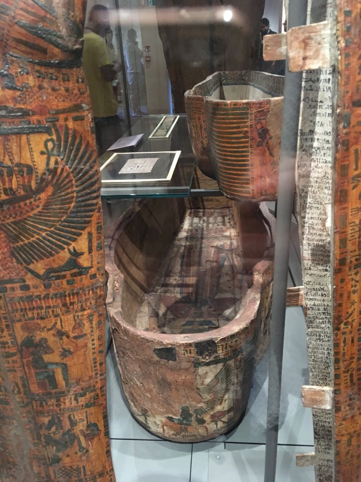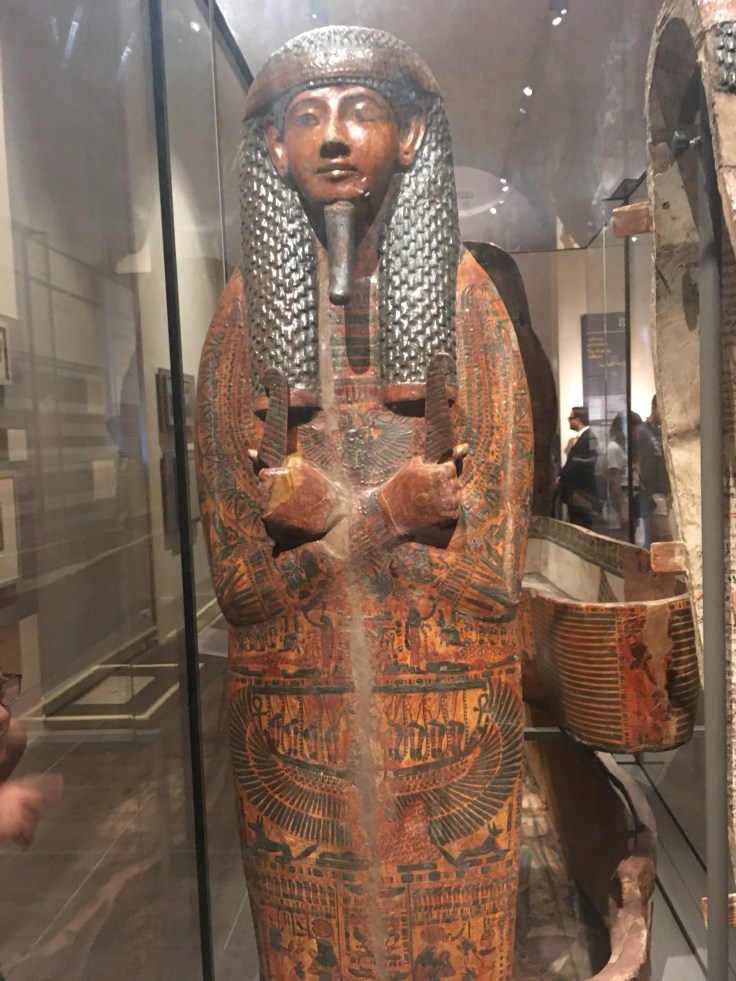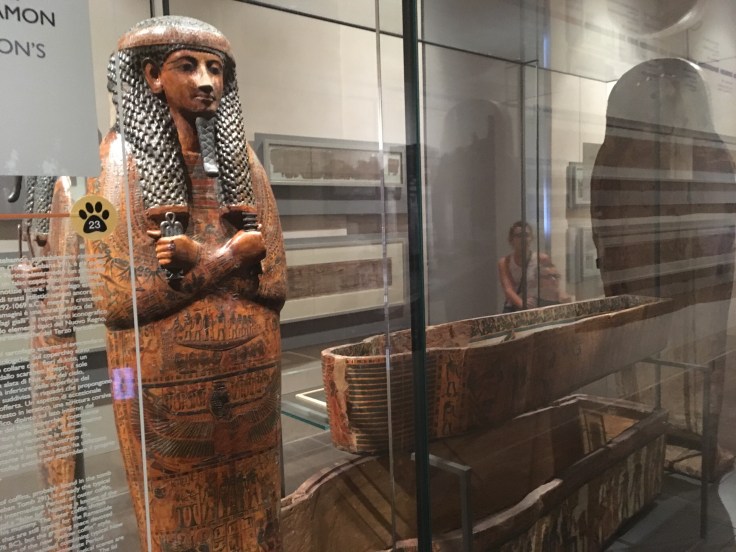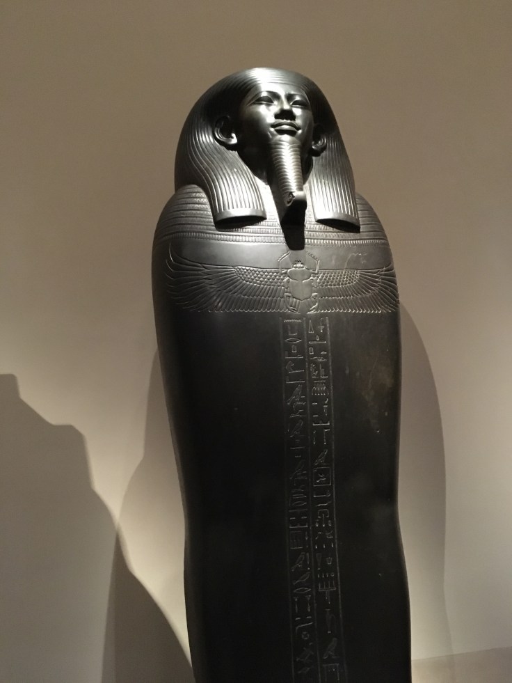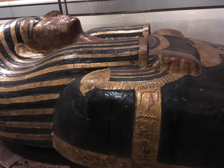 Qu’à cela ne tienne, je décide d’y aller seule. Et je me régale. Les pièces sont extraordinaires. Les salles se suivent, et c’est à chaque fois l’émerveillement. Masques mortuaires, coffrage, momies, Canopée. J’admire des morceaux de papyrus.