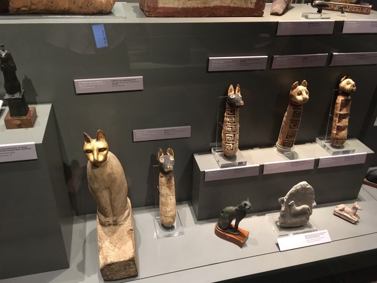 Dans la même pièce il y a quantité de petite momies d’animaux. Les égyptiens sont très attachés à leur animaux domestique mais aussi à emmener dans leur voyage éternel toute la diversité de la faune et de la flore. On trouve donc des chats, des singes, des poussins, des chiens.