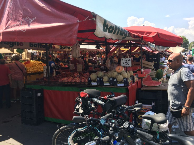 Le gps nous ballade dans tous les sens, nous tombons sur des portes closes. Détour qui nous amène devant le marché de Turin où nous achetons des fruits, constatons les prix. Cela donne envie de revenir pour une grosse côte de bœuf.