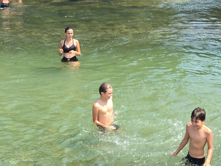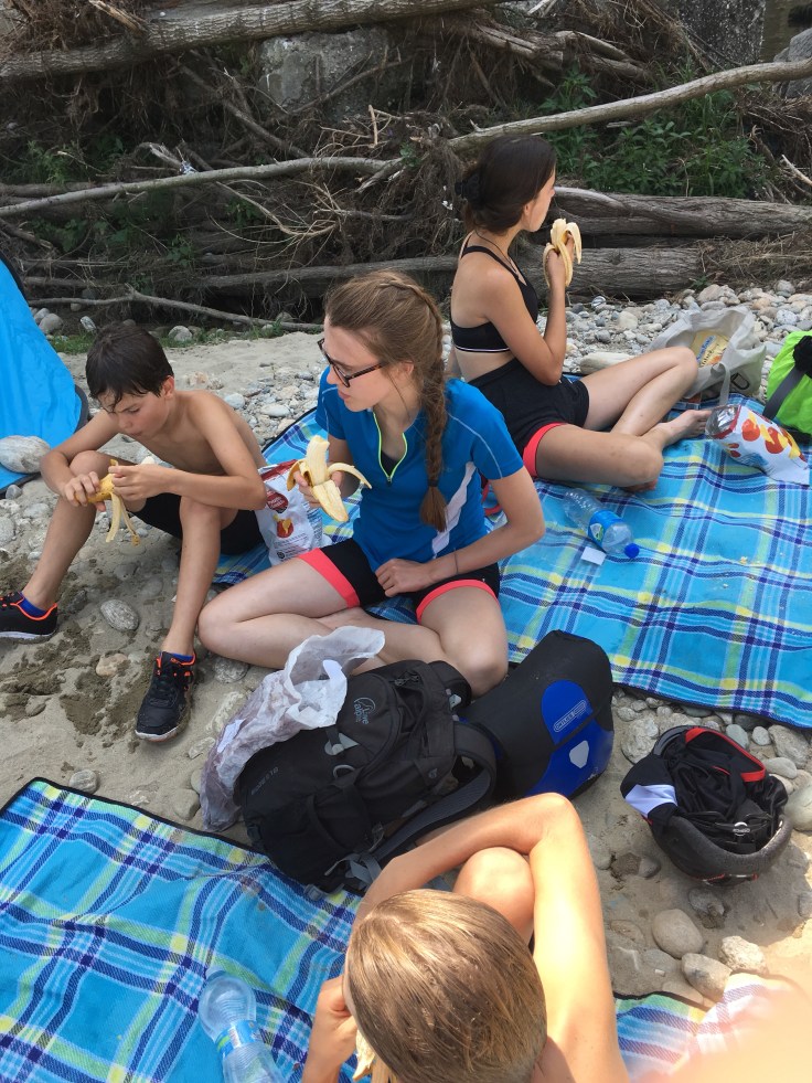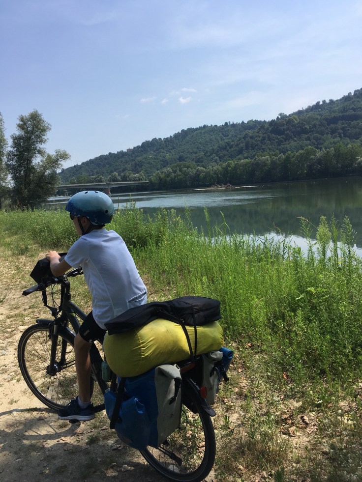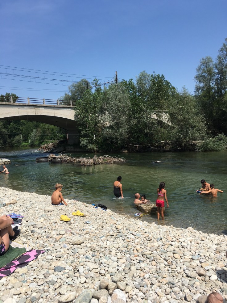 Nous pouvons enfin pédaler dans un peu de nature. Il est presque midi. Nous tombons sur un bord de rivière. Ok on est pas les seuls, il y a merguez, musique italienne (😩🤮) mais l’eau est fraîche et ça fait du bien !