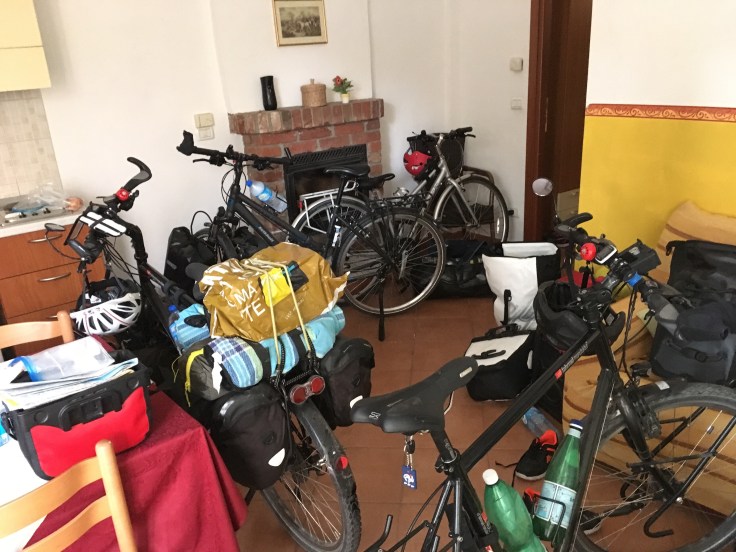Nous nous sommes levés à 6h15. Petit déjeuner bien fourni et pliage des affaires. A 9h nous sommes prêts et comme de coutume, il y a un problème sur un vélo. Celui de Raphaël. Démontage pneu, remontage. Cela nous prend bien 30 min.