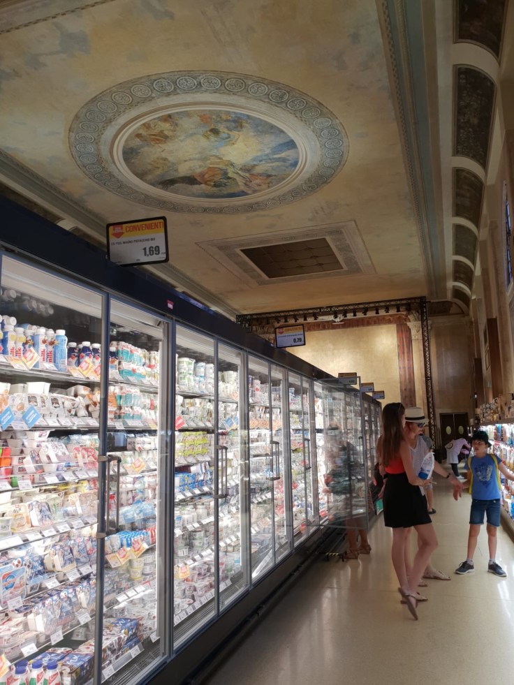 Les estomacs des enfants crient famine, il est 17h30… le repas est loin. Nous découvrons le Spar local, installé dans d’un ancien théâtre vénitien. Beau à l’extérieur.