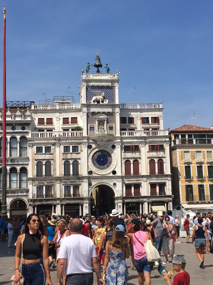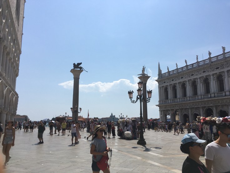 Panique du jour, mes cartes bleues ont disparues. Pascal les a laissé au camping. Il faut qu’il retourne les chercher pour que nous puissions payer les billets. Nous arrivons sur la place Saint Marco à 13h. Il fait une chaleur écrasante, le soleil est de plomb et les mieux bondés de touristes.