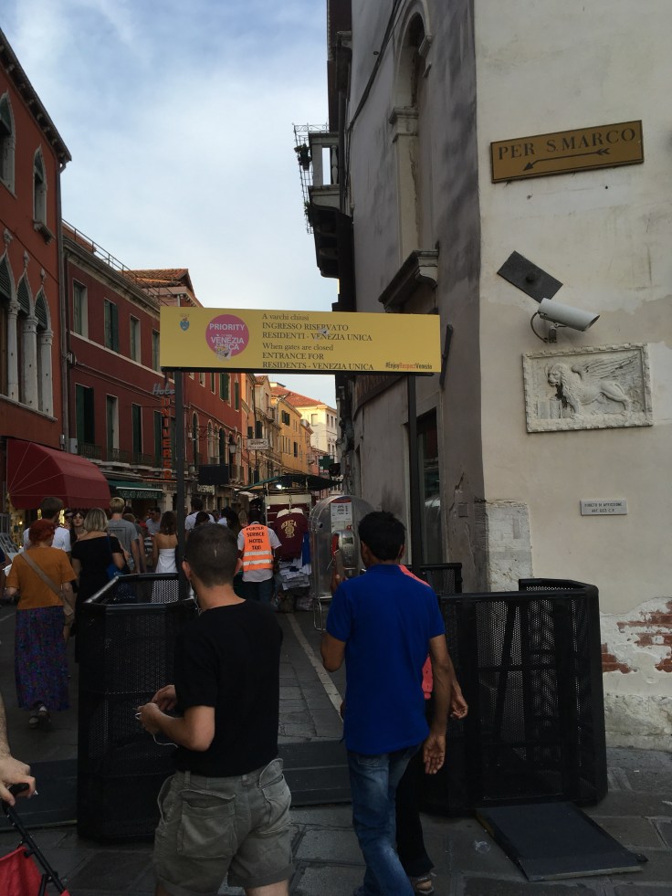 Nous arrivons enfin sur le grand Canal. Nous avons décidé de le descendre en vaporetto. En sortant de la ruelle, nous découvrons les barrières qui bloquent l’accès à la ville les jours de grandes affluences. En effet depuis quelques années, pour tenter de lutter contre l’enfouissement de Venise, les autorités choisissent parfois de réduire le nombre de personnes sur les îles. Dans ce cas là, seuls les habitants ont le droit de pénétrer.