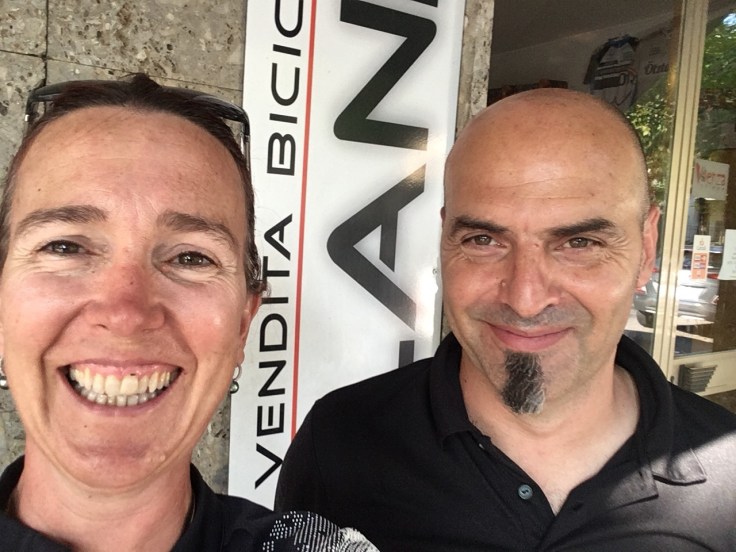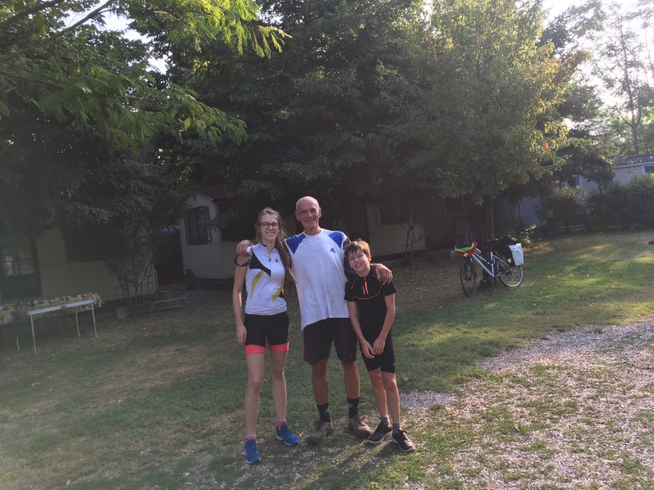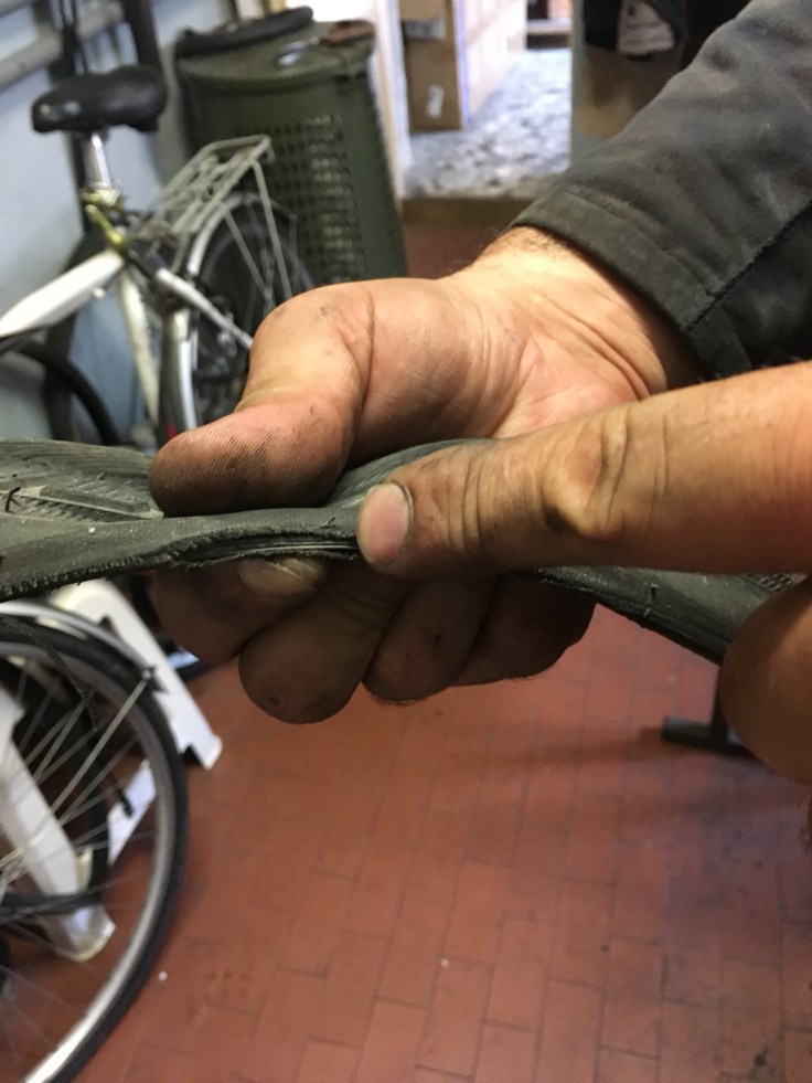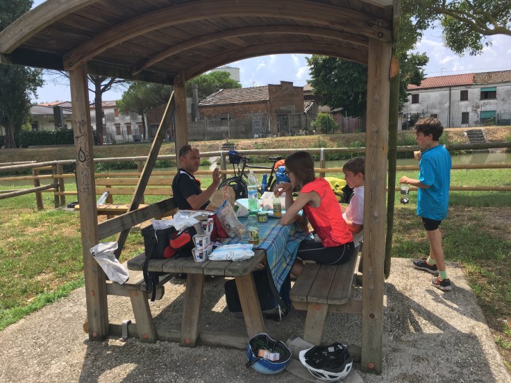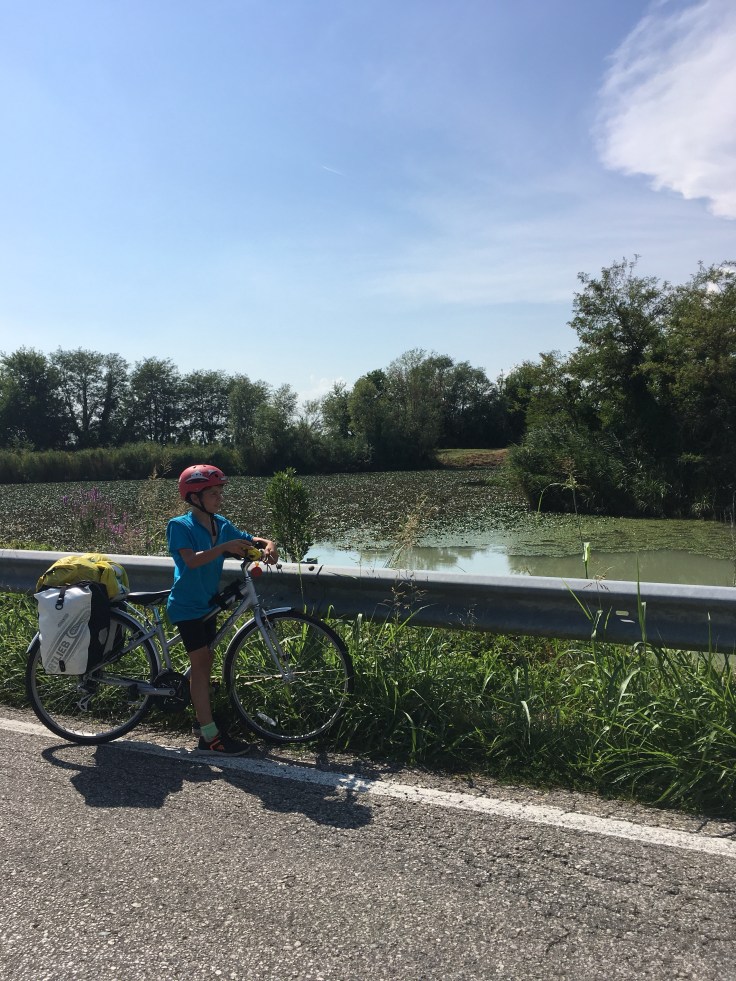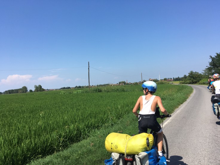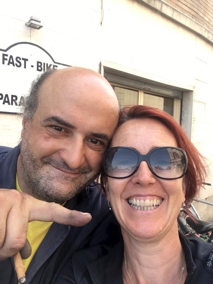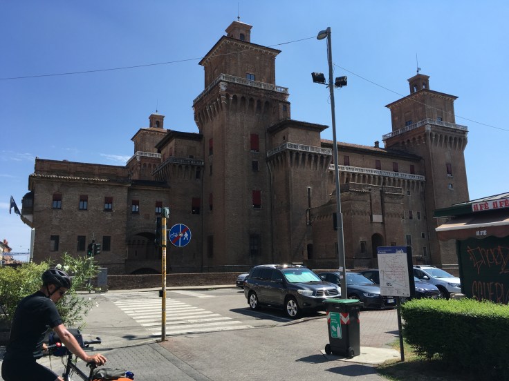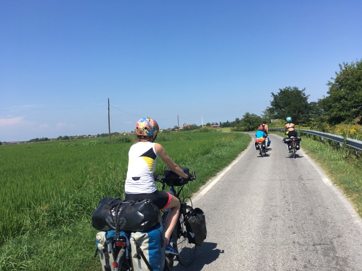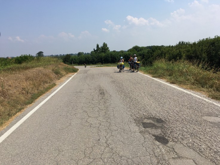 À midi nous sommes à l’entrée de Ferrara. Il faut trouver un réparateur pour le vélo de Solène. J’ai une totale confiance en mon magasin fétiche de vélo à Lyon Vélonaute. Malheureusement, les ennuis s’enchaînent et je suis obligée de revoir mon avis. Certes César a ajouté un grand pignon à Solène pour qu’elle puisse mouliner en cas de montée. C’est elle qui porte la tente, plus de 10kg, en plus de ses sacoches. Mais l’écart entre le pignon de la cassette et le supplémentaire est trop grand. Elle a du mal à passé ses vitesses et son dérailleur n’est pas d’une qualité suffisante pour ce genre d’exercice.