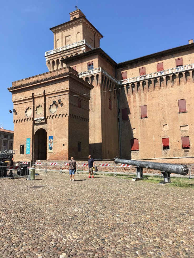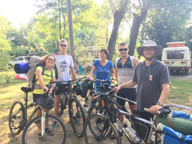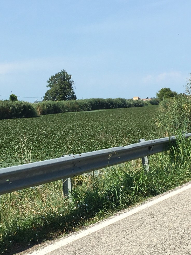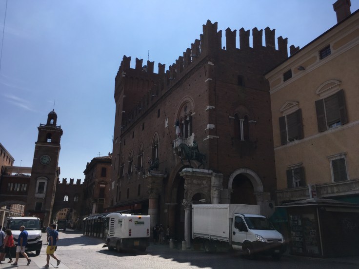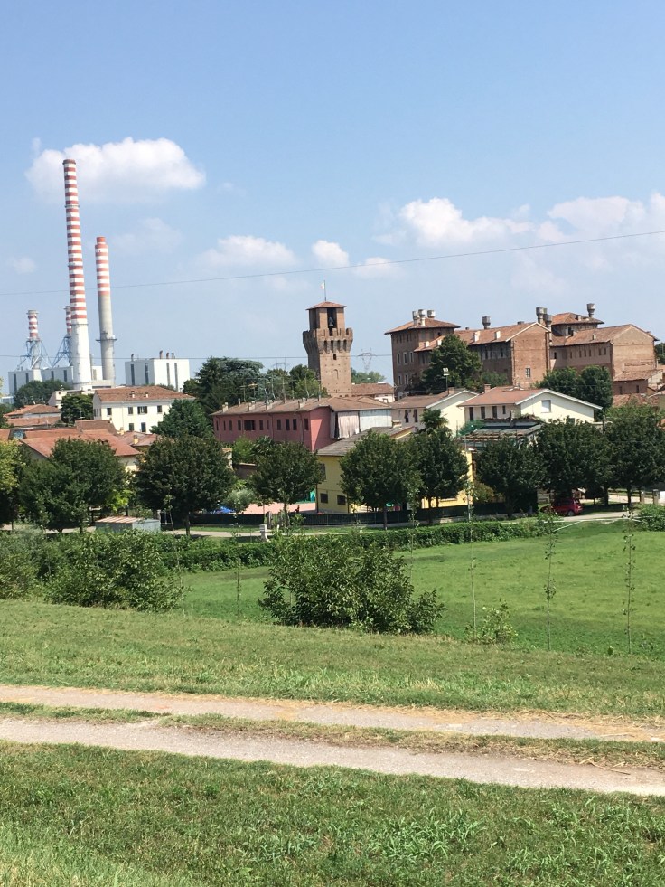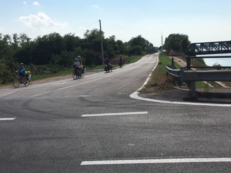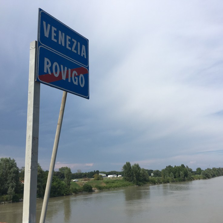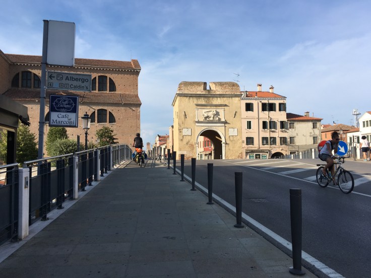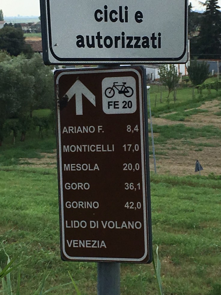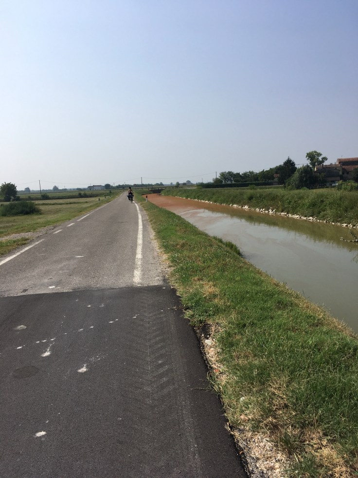 À midi nous sommes à l’entrée de Ferrara. Il faut trouver un réparateur pour le vélo de Solène. J’ai une totale confiance en mon magasin fétiche de vélo à Lyon Vélonaute. Malheureusement, les ennuis s’enchaînent et je suis obligée de revoir mon avis. Certes César a ajouté un grand pignon à Solène pour qu’elle puisse mouliner en cas de montée. C’est elle qui porte la tente, plus de 10kg, en plus de ses sacoches. Mais l’écart entre le pignon de la cassette et le supplémentaire est trop grand. Elle a du mal à passé ses vitesses et son dérailleur n’est pas d’une qualité suffisante pour ce genre d’exercice.