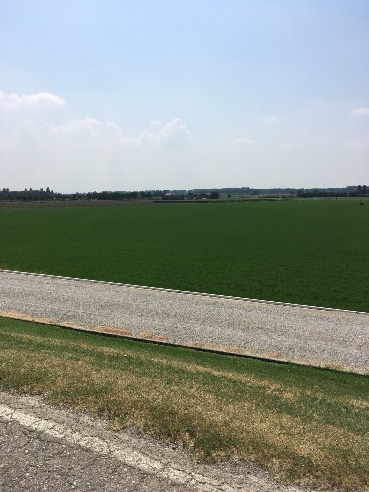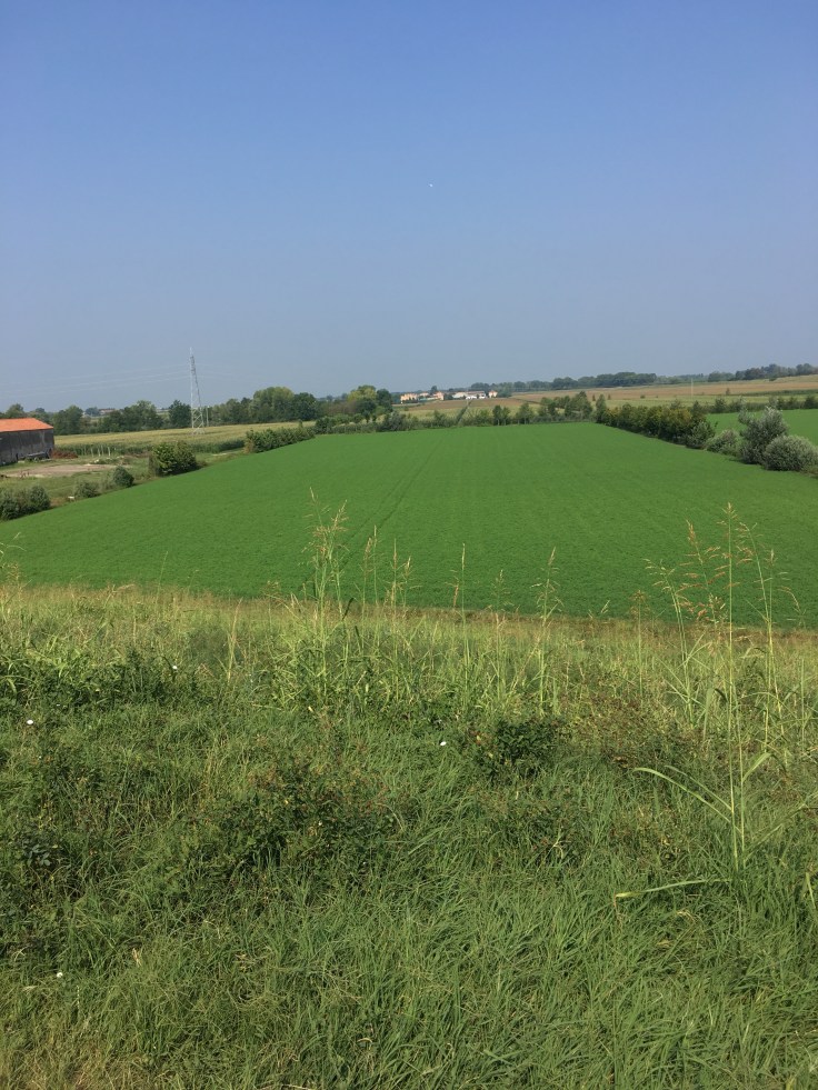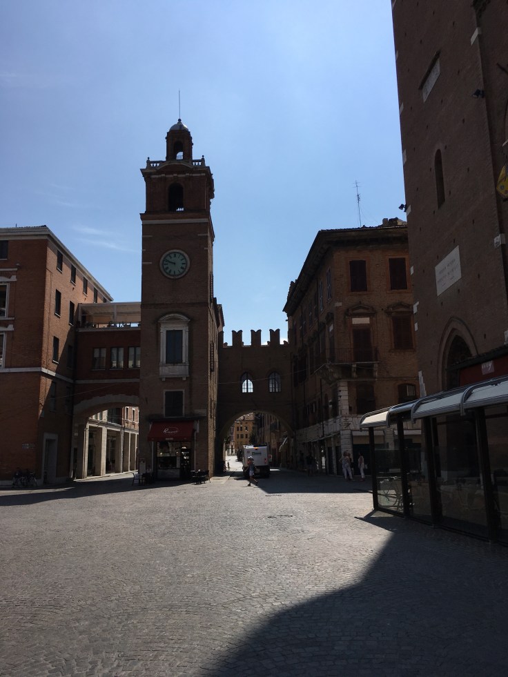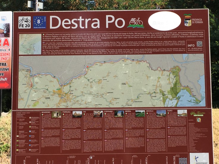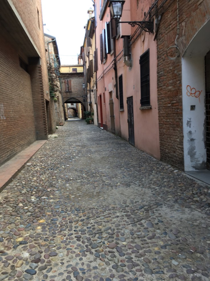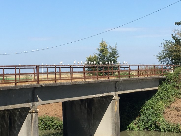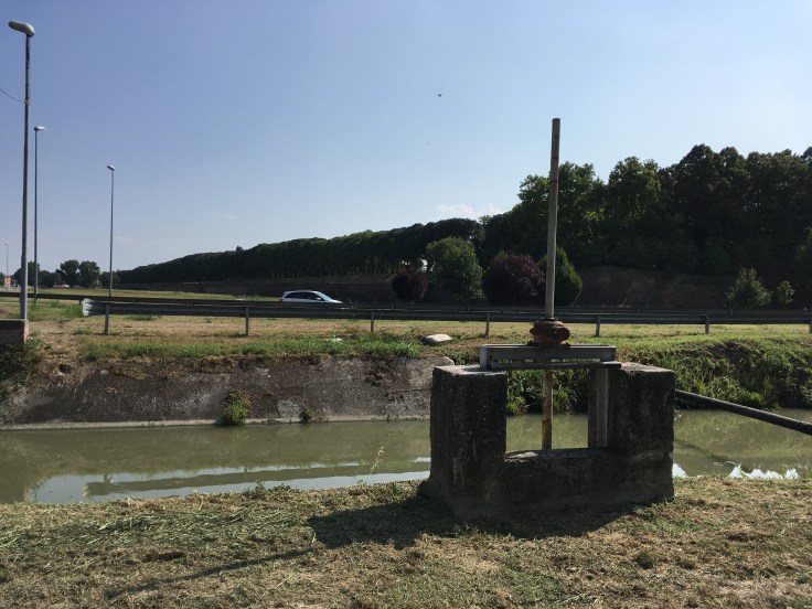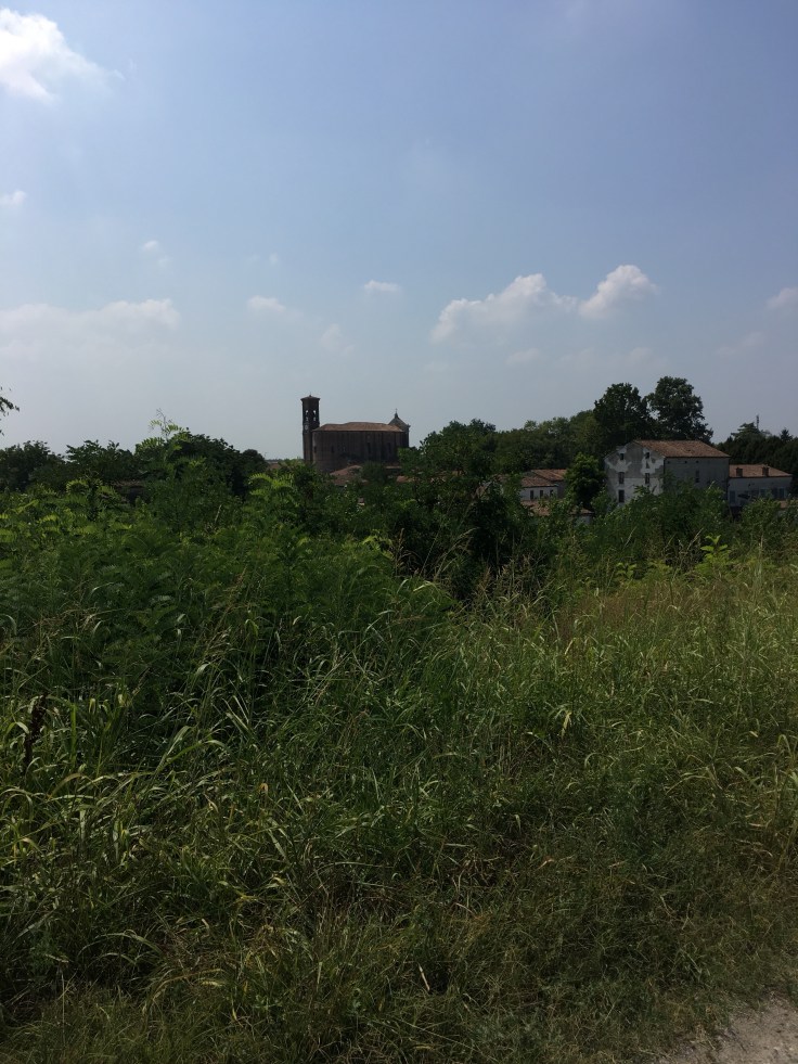 À midi nous sommes à l’entrée de Ferrara. Il faut trouver un réparateur pour le vélo de Solène. J’ai une totale confiance en mon magasin fétiche de vélo à Lyon Vélonaute. Malheureusement, les ennuis s’enchaînent et je suis obligée de revoir mon avis. Certes César a ajouté un grand pignon à Solène pour qu’elle puisse mouliner en cas de montée. C’est elle qui porte la tente, plus de 10kg, en plus de ses sacoches. Mais l’écart entre le pignon de la cassette et le supplémentaire est trop grand. Elle a du mal à passé ses vitesses et son dérailleur n’est pas d’une qualité suffisante pour ce genre d’exercice.