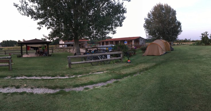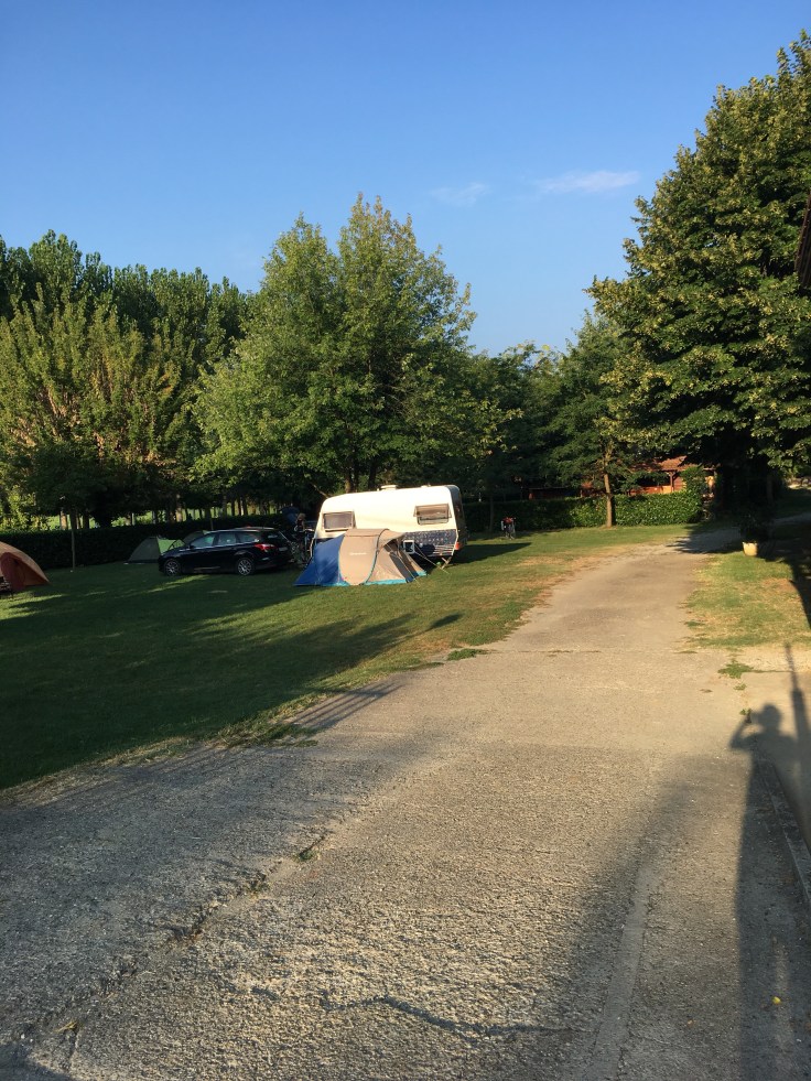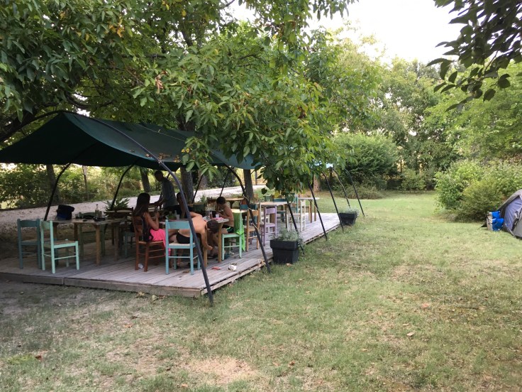 Je suis trempée, mais bien contente d’avoir réussi à enlever mes tentes de sous les platanes plein de « poux du platane » qui nous salissaient tous les habits et les tentes. En plus l’emplacement est plus grand.