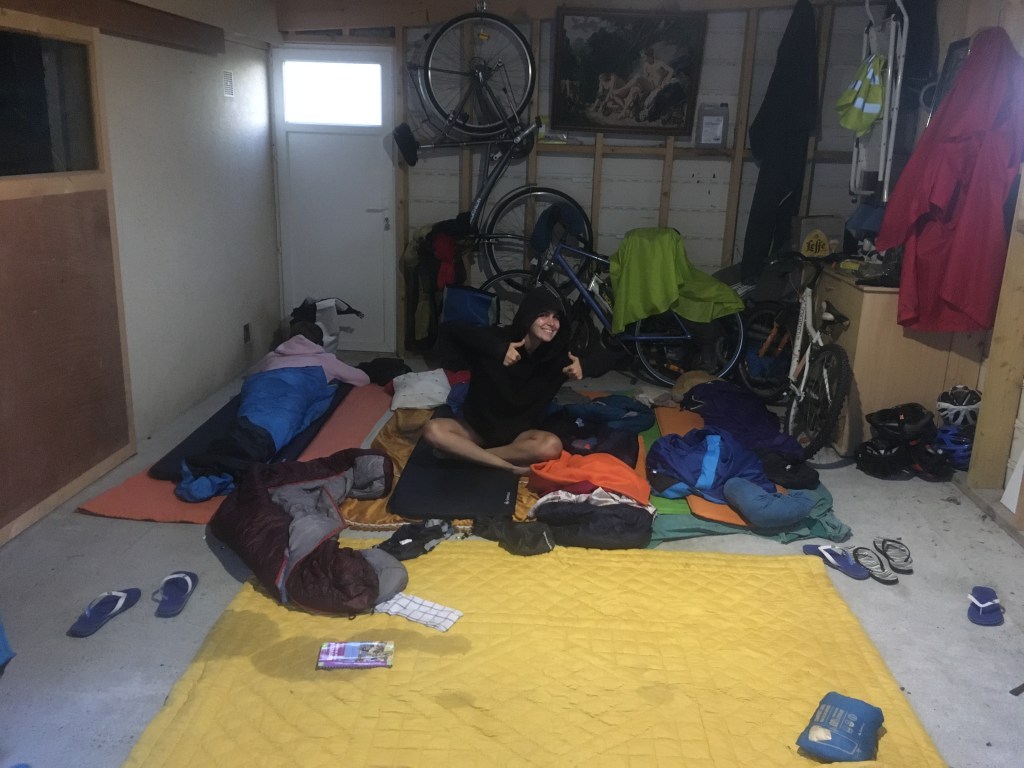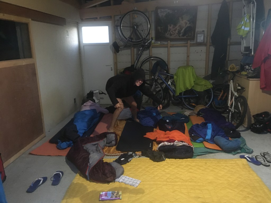 Pascal s’est réveillé avant nous il a tenté de voir le lever de soleil malgré un plafond bas à ce moment-là. Il a petit déjeuné seul et se prépare à partir pédaler plus loin en solitaire. Il est presque 11h.