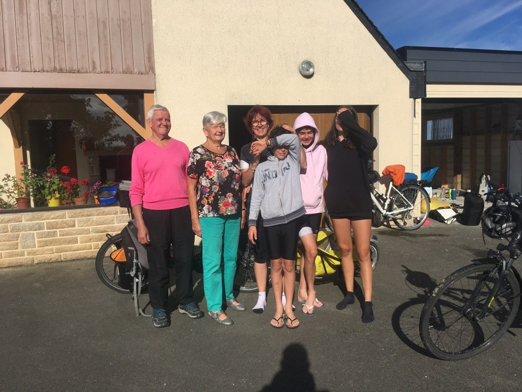 Alors que nous sommes sous l’eau depuis plus d’une heure, nous appelons un premier camping. « Désolé Madame mais je ne prends pas les clients qui le restent que pour une nuit ». Donc en fait vous préférez vous passer d’1 nuit alors que vous n’êtes pas complet ….. J’avoue mon côté commerçant ne comprends pas. Nous arrivons à Matignon, le village… pas le palais- à 18h00. Nous sommes congelés et trempés. En passant devant la maison paroissiale j’ai un espoir d’être accueillie, de nous mettre au chaud. Malheureusement personne et aucun numéro pour appeler en urgence. Nous repartons. En chemin, Raphaël signale le panneau gîte devant une maison. La dame est devant sa porte et me voit venir vers elle. C’est Mme Bardu et son époux. Ses gites sont malheureusement pleins. Au vu de son sourire, j’ose… « Auriez vous un garage pour nous accuuelllir, pour nous mettre au sec ? » La réponse est…. oui. Annick et son époux sont adorable. Ils sortent une voiture du garage pour nous permettent d’y dormir.