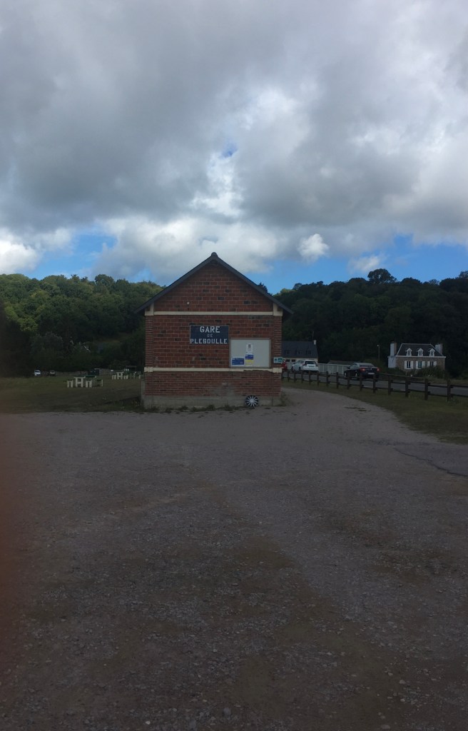 Sur notre chemin, la gare de Pleboulle au bout de la anse. Très drôle car il n’y a plus de rail. Le bâtiment est entretenu et sert à d’autres usages dorénavant, mais il est drôle qu’il ait gardé sa plaque d’identification originelle.