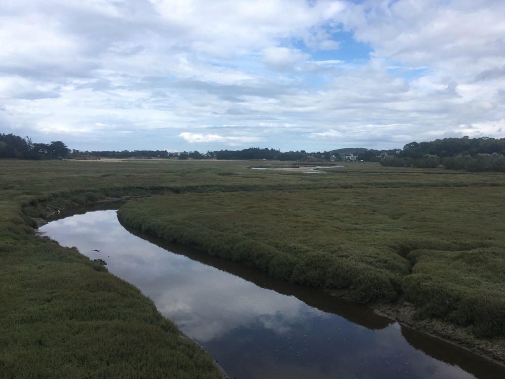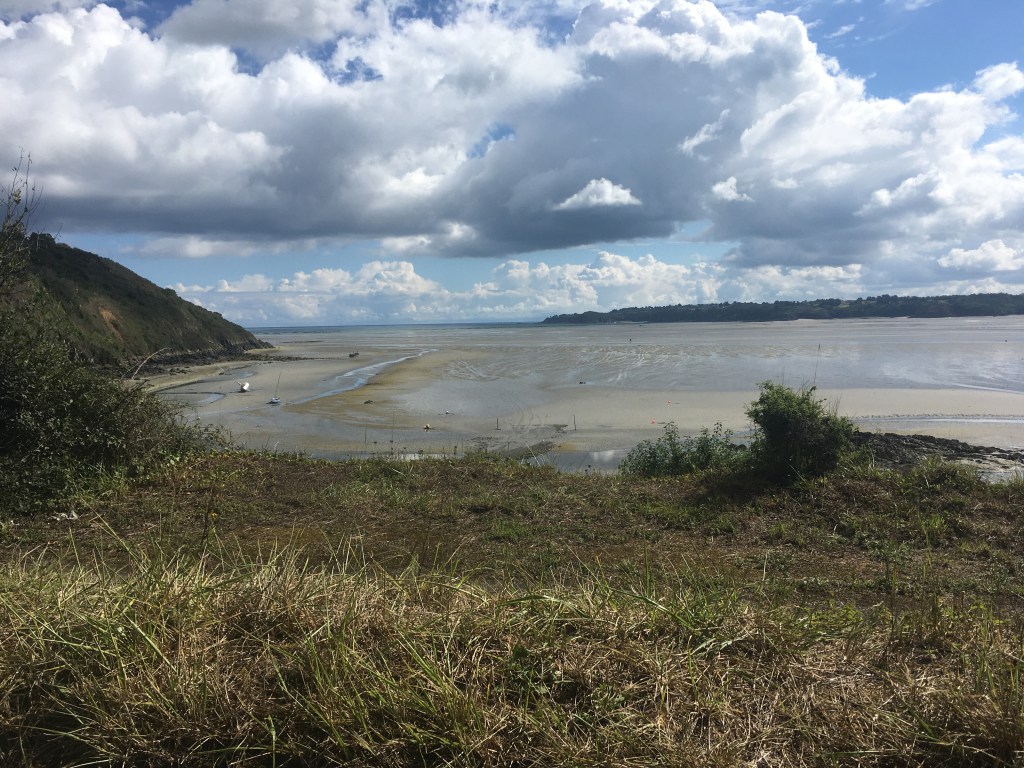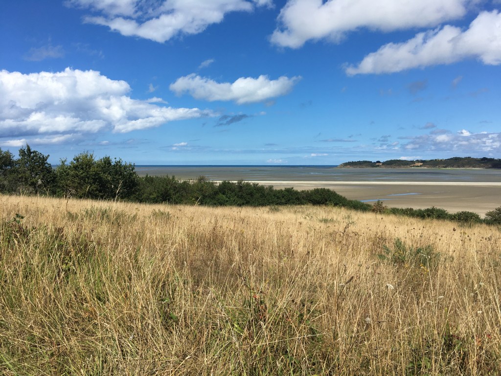 Nous repartons en longeant la baie de Saint Brieuc. Le paysage est sublime. La mer est à marée basse et la baie nous dévoile son tapis de verdure sur lequel des mouettes se reposent. La vase brille des reflets du soleil, les herbes folles sèches attendent la marée.