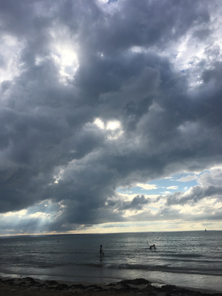 À nous 5, nous remplissons le petit bateau avec nos vélos et nos sacoches. L’impression d’être les rois du pétrole quand nous voyons au loin la navette pleine à craquer. Une fois à Dinard, nous logeons le rivage pour sortir de la ville. La mer est toujours aussi belle, d’un bleu vert incroyable. Une fois sortis de la ville pause picnic. Le ciel est menaçant alors que nous sommes pour le moment en plein soleil. Il tape du fort sur nous sommes obligés de déplacés notre plaid pour nous mettre à l’abri. Pourtant au loin des gros nuages noirs s’amoncellent et menacen’y. Pascal fait tomber la nouvelle, orage prévu dans 30 min. Je me souviens de notre deuxième voyage à vélo. Nous étions alors sur La Loire à Vélo. Ce jour là, nous avions réussi à filer plus vite que la pluie et à arriver au camping avant qu’elle ne nous tombe dessus. Aujourdhui, les applications nous président avec justesse pluie ou soleil à quelques minutes près. C’est moins drôle mais bien pratique.