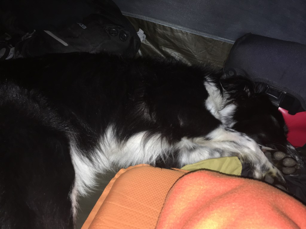 Nous avons eu droit à un orage mémorable dans la nuit. Il a tonné et plu si fort qu’Osiris, morte de trouille à obtenu de rentrer dans notre tente. La pauvre chienne n’en menait pas large. Elle a fini sa nuit sur nos pieds. Heureusement que nous avons une 3 places.