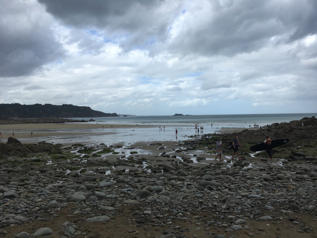 C’est la marée basse. Nous sommes interpellés par la présence du drapeau rouge, signe qu’il est interdit de se baigner. Mais se baigner dans quoi, la Manche est super loin pour le moment.