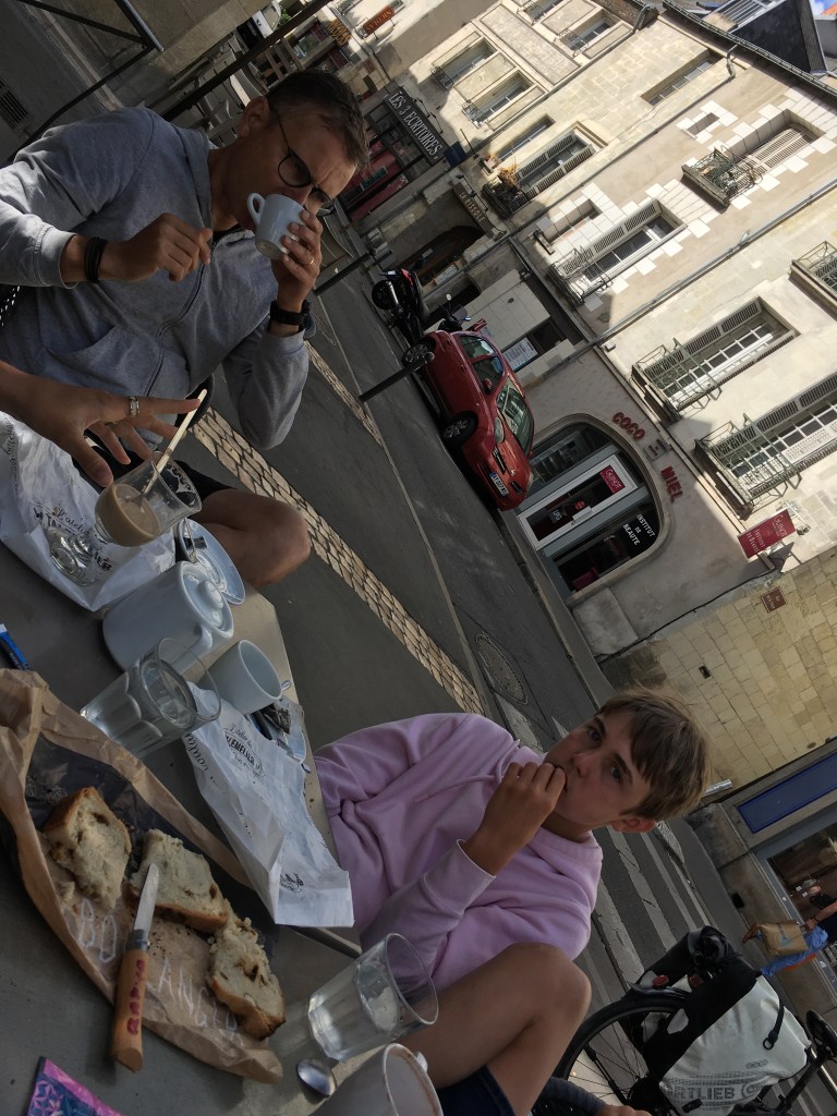 La journée s’annonce avec quelques nuages mais aussi du soleil. Petit déjeuner tranquille avant que Solène et moi allions en ville faire quelques courses pour les repas du jour. Les garçons vont promener Osiris.