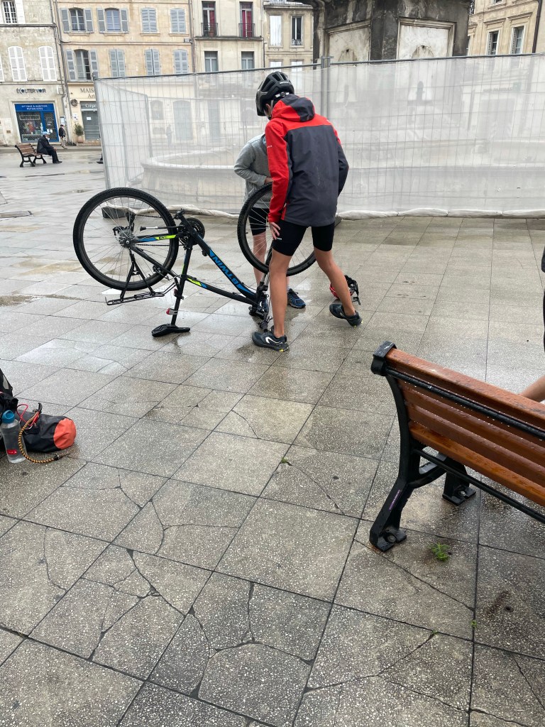 À 10h45 nous sommes à Arles. Et Gabriel crève. Il faut réparer. Heureusement, il ne pleut plus.