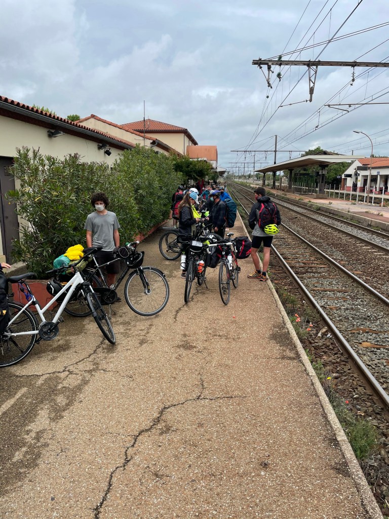 Arrivés à la gare, nous constatons qu’il y a au moins 25 vélo sur le quai. Le train de 12h40 est en retard. C’est un TER avec seulement une rame. Le contrôleur refuse l’accès à tous les vélos. De toutes façons, la rame est bondée. Il faut attendre le suivant. Et croiser les doigts. Oui, nous avons bien fait de venir plus tôt !