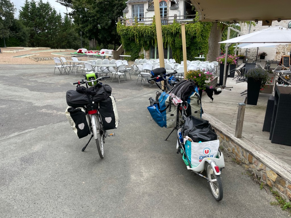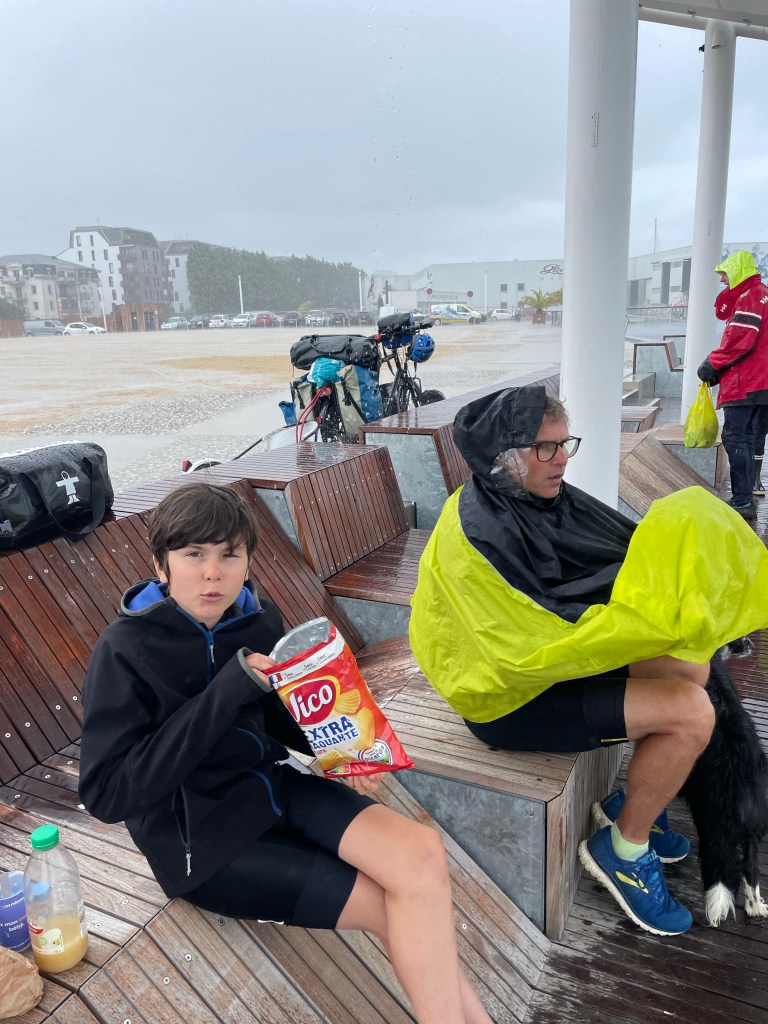 Réveil à 7h00 pour Pascal et moi, 7h39 pour Raphaël. Nous voulons partir vite. En 1h30 le campement est plié. Nous prenons notre petit déjeuner sur les tables de l’accueil et à 9h29 nous décollons du camping.