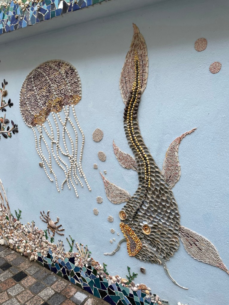 Dans la ville, nous visitons la quartier de l’île Penotte. Une artiste, Dan Aubrin décore le quartier par des fresques réalisées avec des coquillages. C’est surprenant et assez poétique.