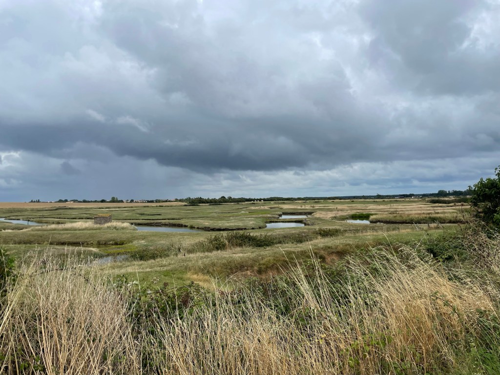 Après la côte, les marais salants. La vue est encore saisissante. Le plafond bas et gris rend la lande encore plus nostalgique.