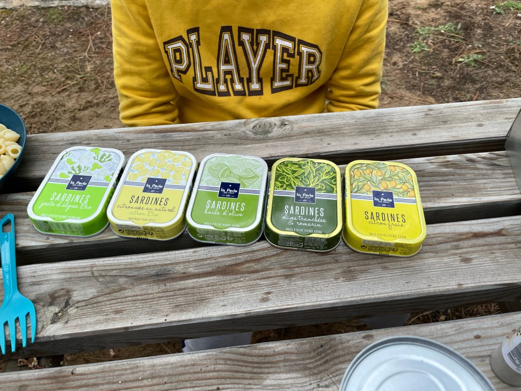Repas costaud pour nous restaurer. Pâtes, sardines achetées ce midi ( pas tout juste deux boîtes rassurez-vous, et crème Mont-Blanc.
