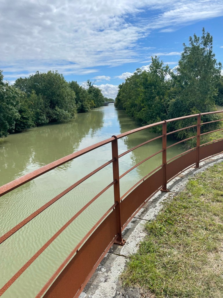 Nous reprenons la piste. Nous longeons le canal de Luce. Et comme à chaque fois. Vent de face. Mais au moins il fait beau. Cela fait du bien de voir le ciel bleu.