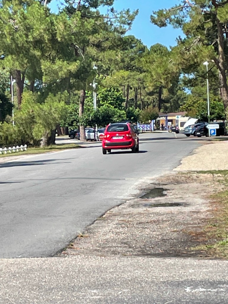 La piste passe entre lez pins, puis suis la route des plages. Nous sommes loin de l’océan. Le soleil tape fort. Je ne me méfie pas. J’en payerai le prix ce soir. Contrairement à ce que prévoyait la panthère préférée, je vais les avoir les coups de soleil et les traces de bronzage 🌞