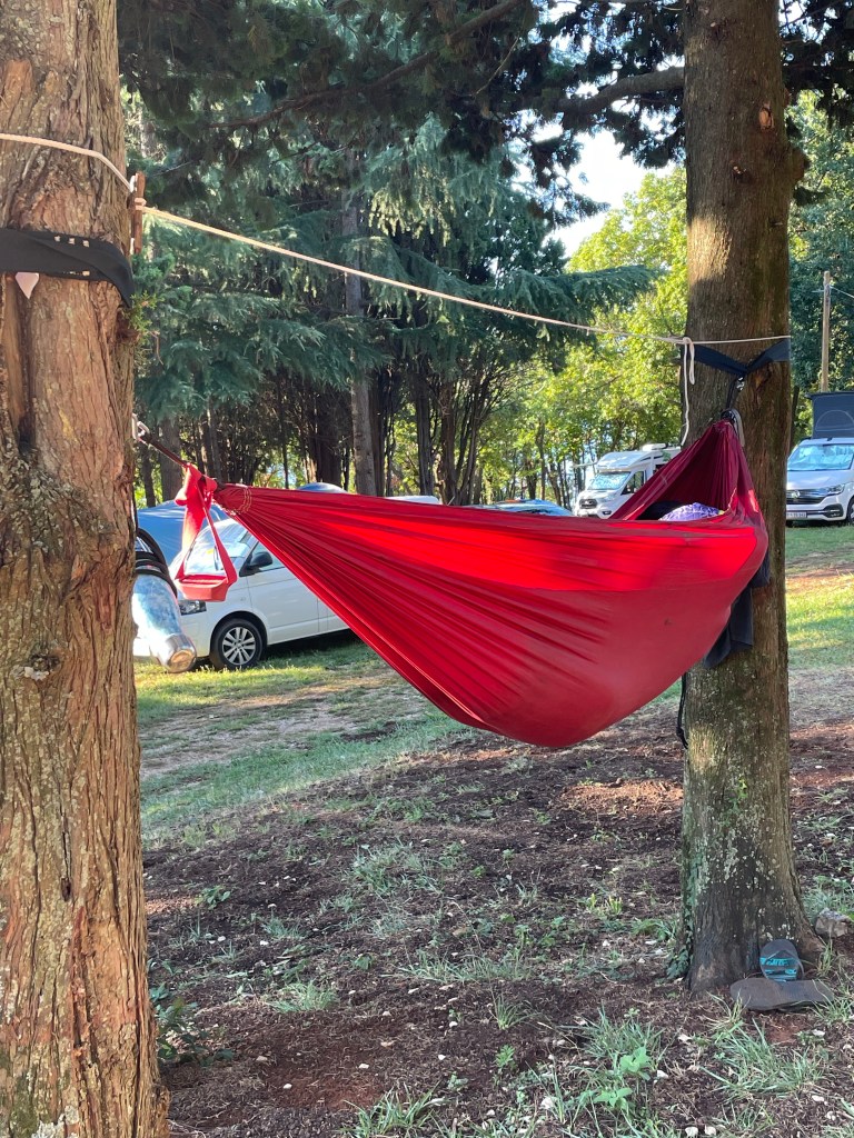 On pose les vélos. On installe les hamacs de garçons et direction la mer ! Se rafraîchir ! Enfin.