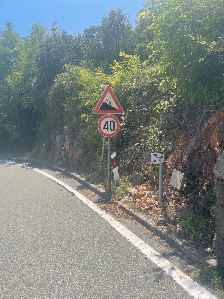 Nous sommes descendus à la mer et nous devons passer un col. Pas d’info sur le dénivelé mais après l’avoir fait je table pour un bon 10% …. Et pour un long moment.