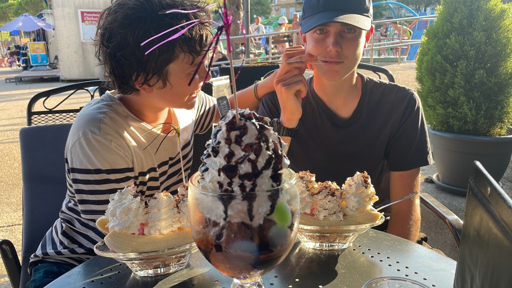 Les garçons jouent en attendant la pizza. Un coucher de soleil magique.
