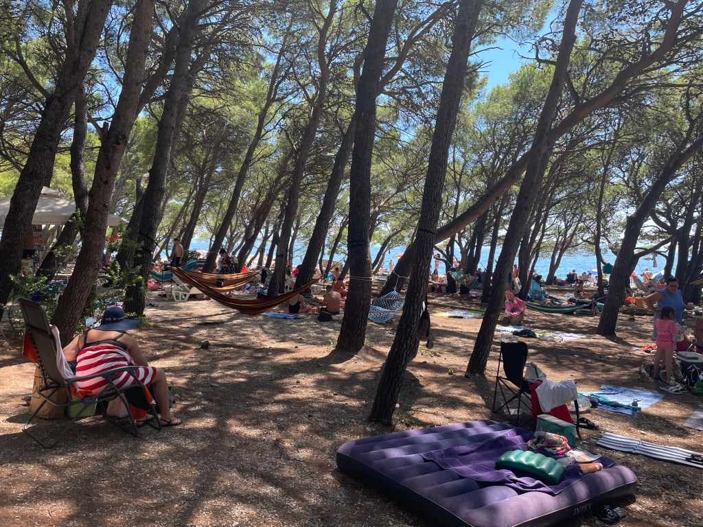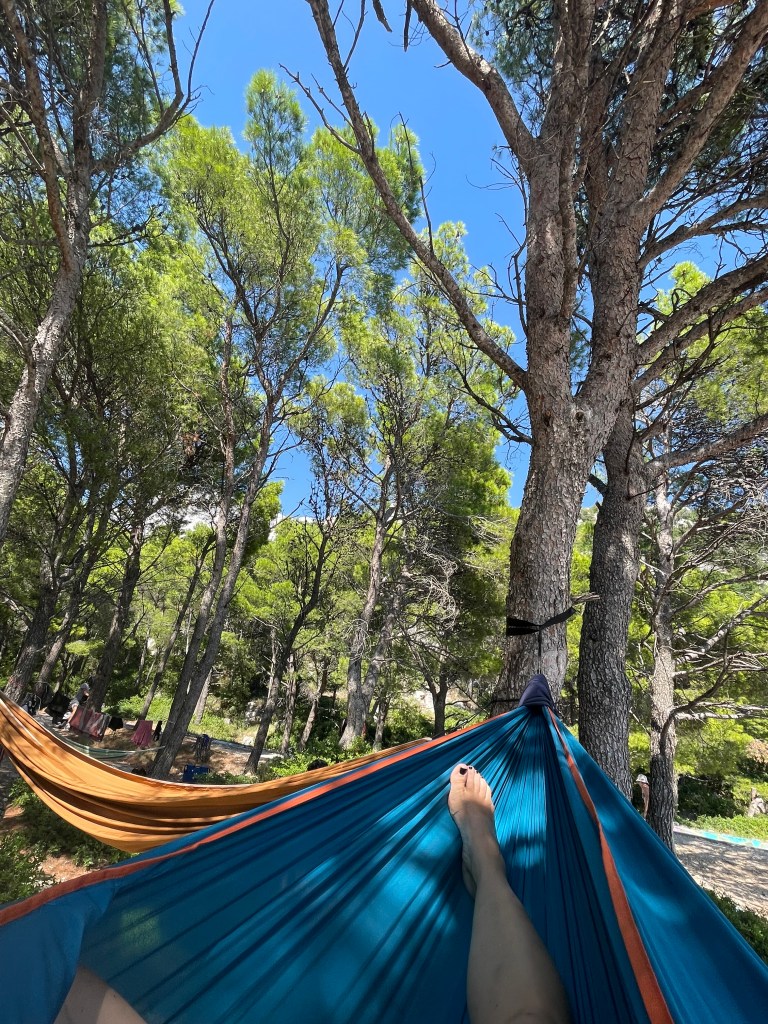 C’est populaire, plein de familles, de jeunes. Pas trop de musique, on entend les cigales. Plein d’arbres pour accrocher les hamacs. La moindre petite place est utilisée, nous ne sommes pas seuls.