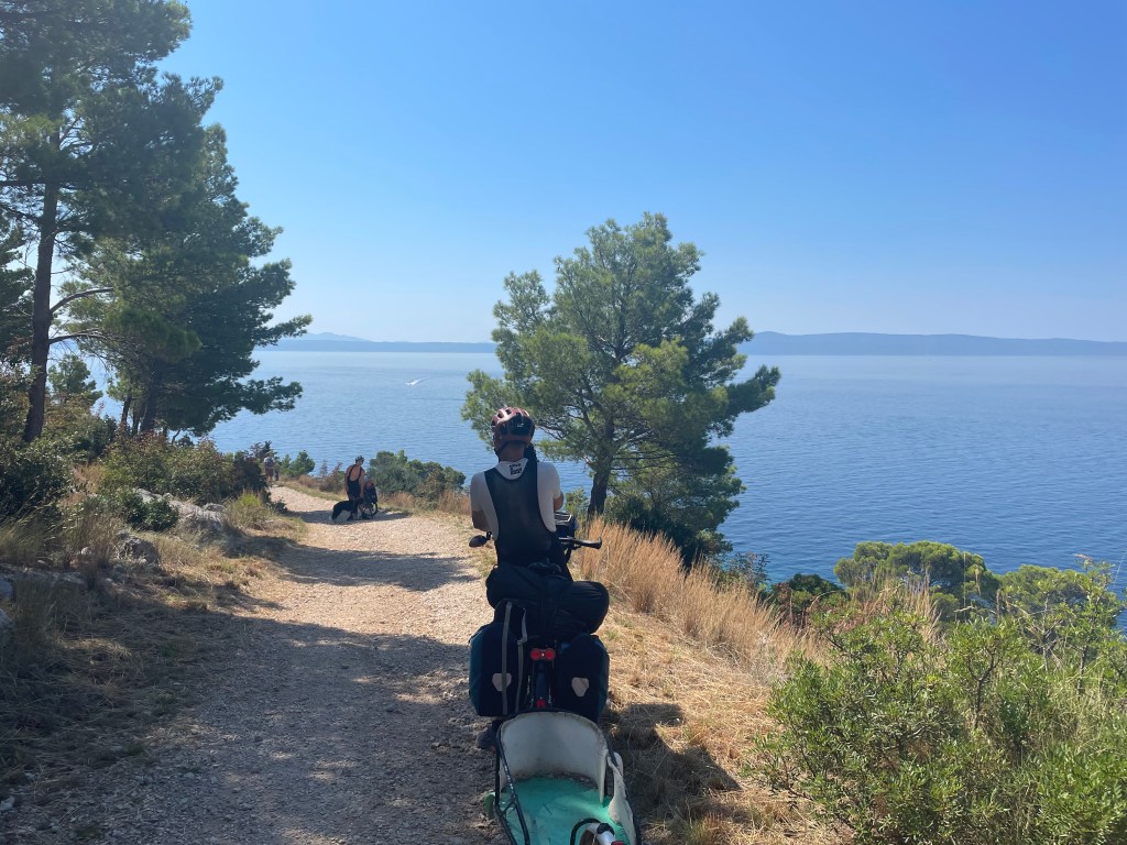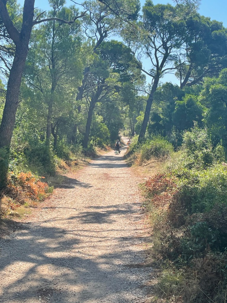 La sortie du village nous fait tourner en rond avant de nous amener sur un chemin de randonnée que nous allons suivre pendant environ 1h. C’était hyper technique, ne pas tomber, ne pas glisser … mais c’était juste magnifique. Pédaler au milieu des pins parasols en ayant une eau cristalline en dessous de nous. On a adoré ! Tellement beau.