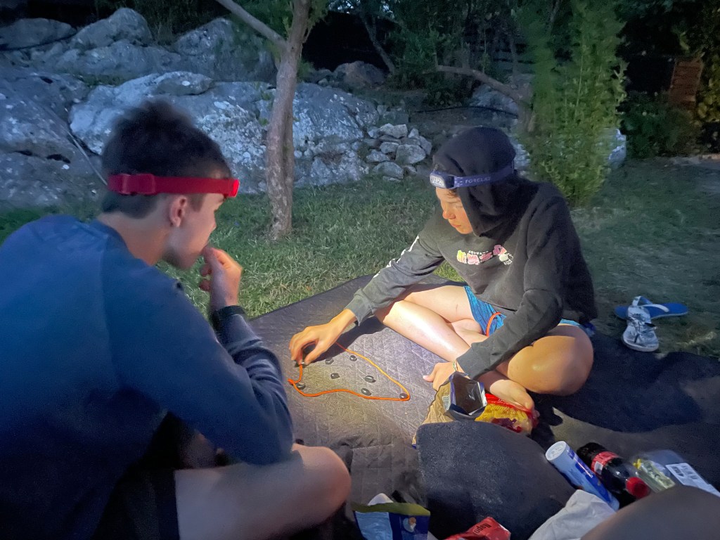 C’est là que nous nous installons pour la nuit. Une grande bâche pour dormir. Des pâtes à la sauce pesto … de la vraie Solène… et au dodo.