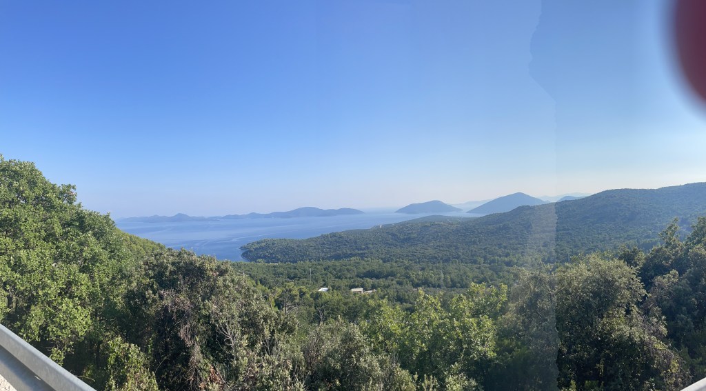 J’use de mon charme … oui oui… même en cuissard avec le casque sur la tête 🤪 et demande à un chauffeur de bus touristique de bien vouloir se mettre derrière moi pour ralentir et contenir un peu les chauffards croates. Il est d’accord et nous donne l’espoir de trouver un ferry de nuit entre Dubrovnik et Rijeka.