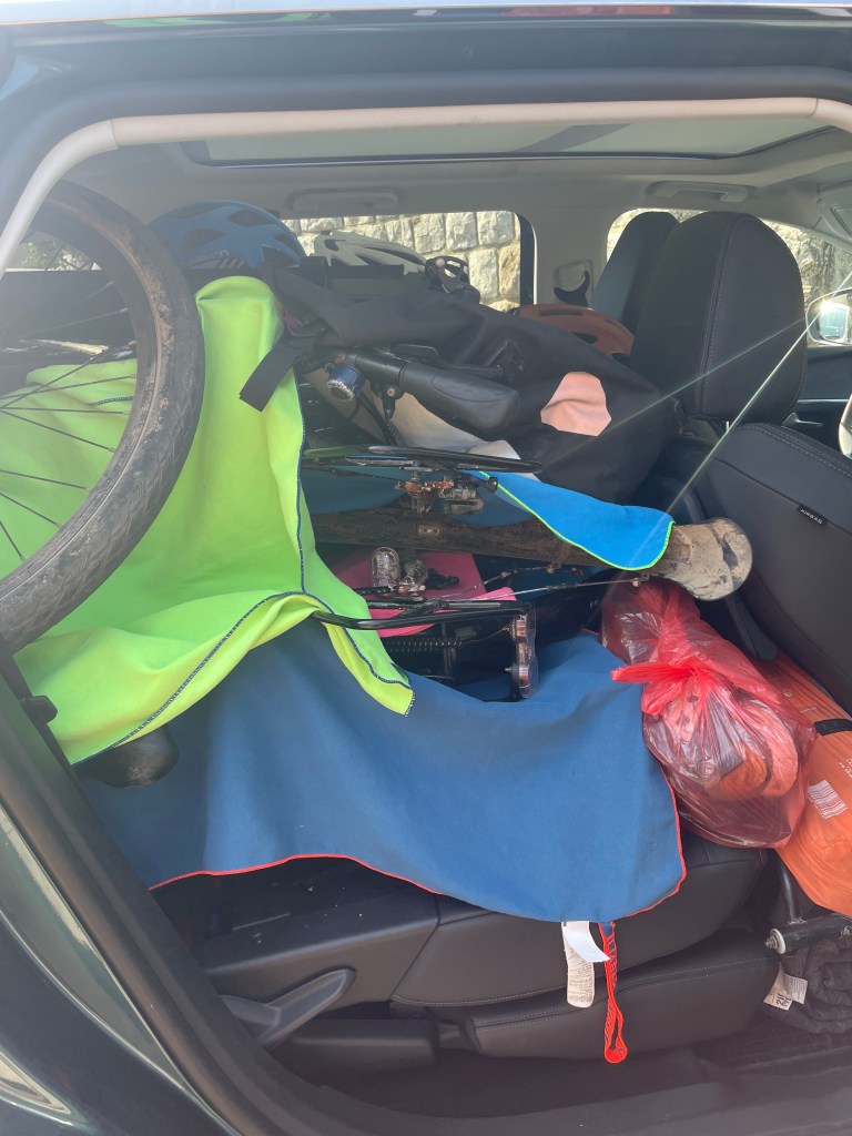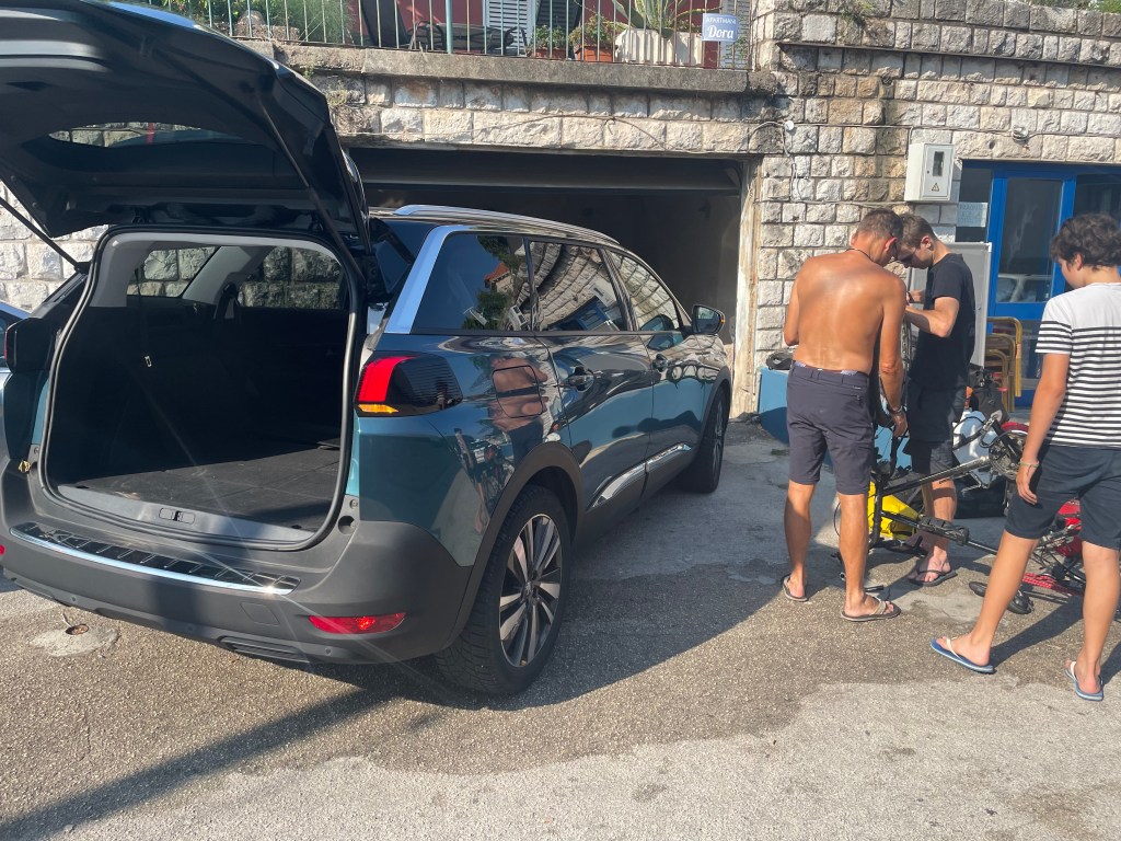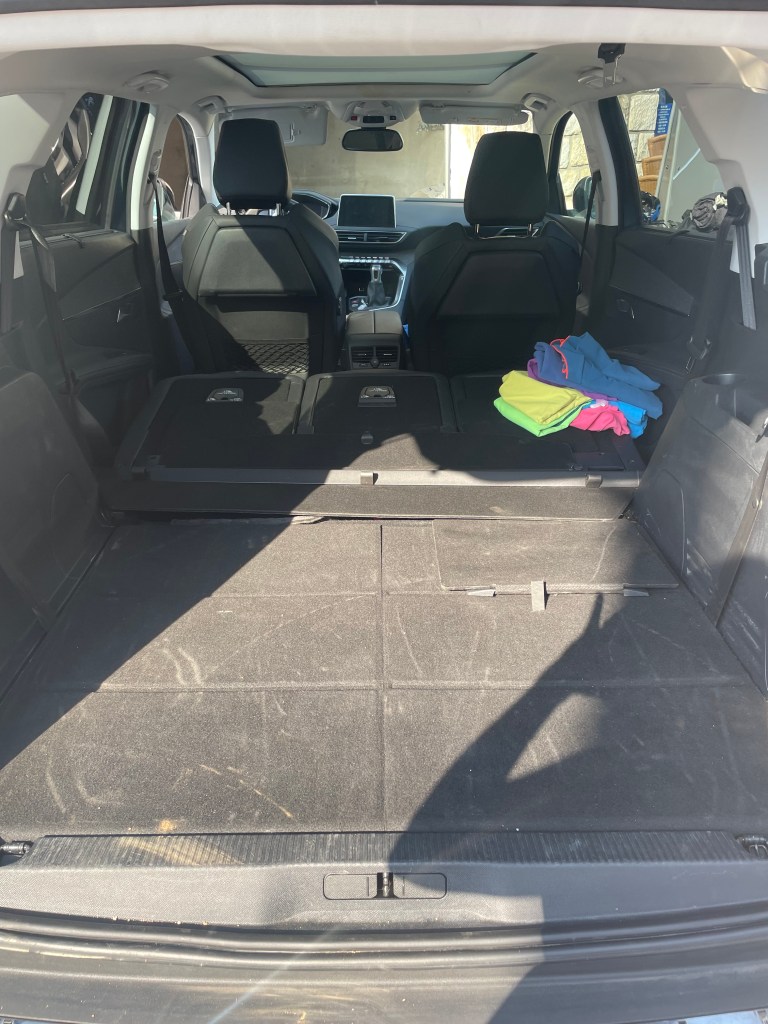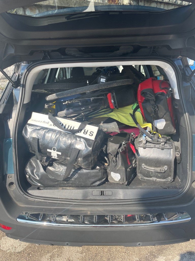 Alors que je patiente devant un loueur, un autre loueur me propose un transfert à 550€. Je prend ! Finalement cela ne marche pas, mais il m’a trouvé une solution. Un 5008 dans lequel j’espère mettre 4 vélos, 1 cariole, 16 sacoches vélos, 8 sacs, 2 enfants et un chien 🫣🤪😩😳