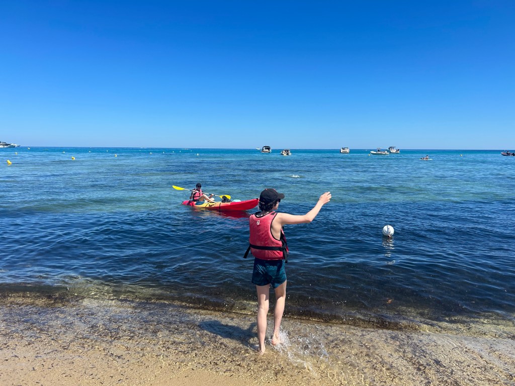 Savoir se retourner pour voir au loin. Raphaël admire le paysage en attendant Et en bas l’eau cristalline. On est dans une zone viticole