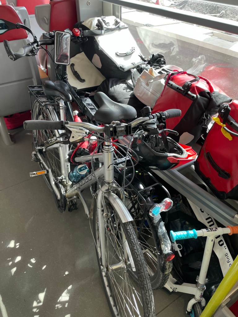 Nous repartons à 14h30. Il faut très chaud mais nous pédalons bien, la Clim fonctionne à plein 😉. Il reste 15 km de vélo.