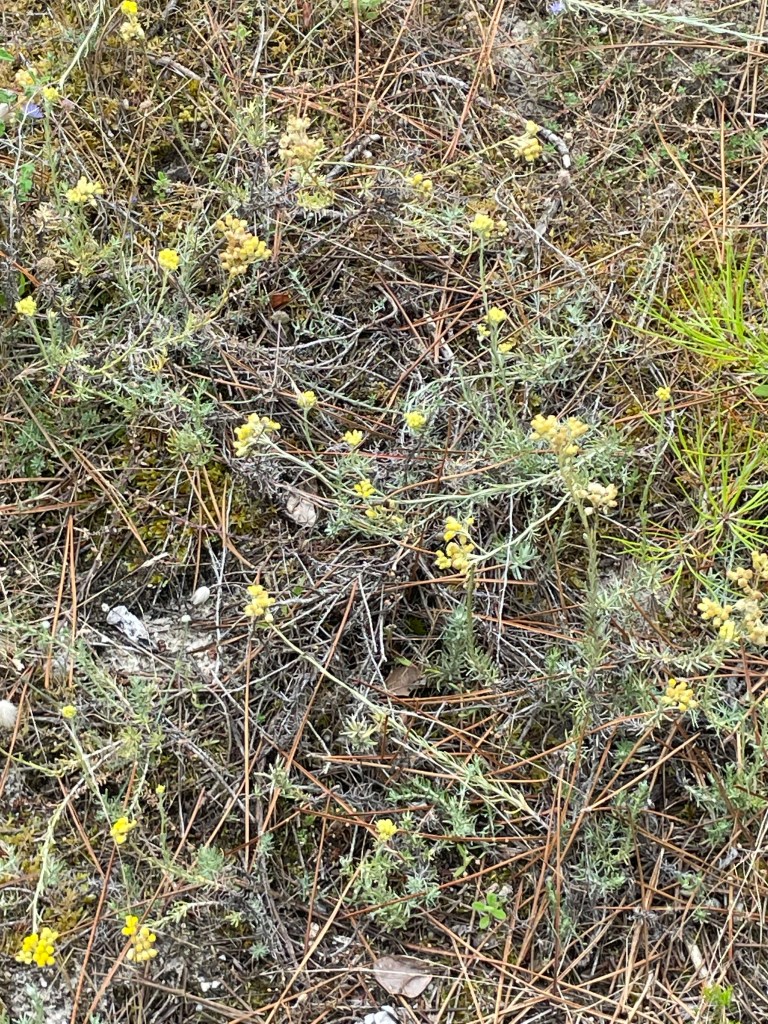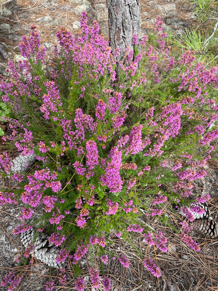 Le tapis sous les pins a changé de couleur. Il y a maintenant du jaune aussi. Une petite plante que je ne reconnais pas. Si quelqu’un a la réponse, je suis preneuse. C’est très doux.
