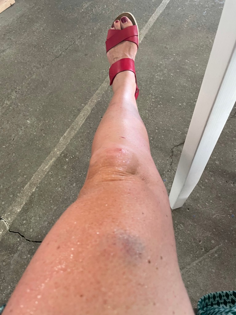 Alors que nous rattrapons Pascal, accident bête. Je chute entre son vélo et le mien. Coincée entre les deux vélos. Mes jambes en prennent un coup. Surtout la gauche.
