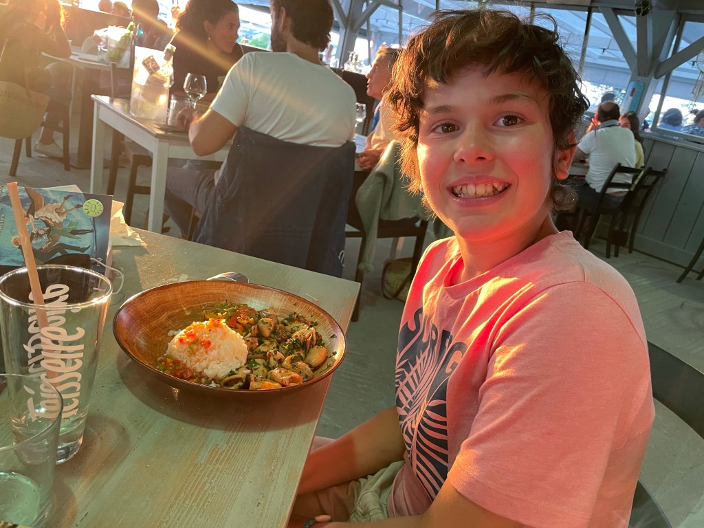 Raphaël lui se régale avec des petits chipirons ( des petits calamars).